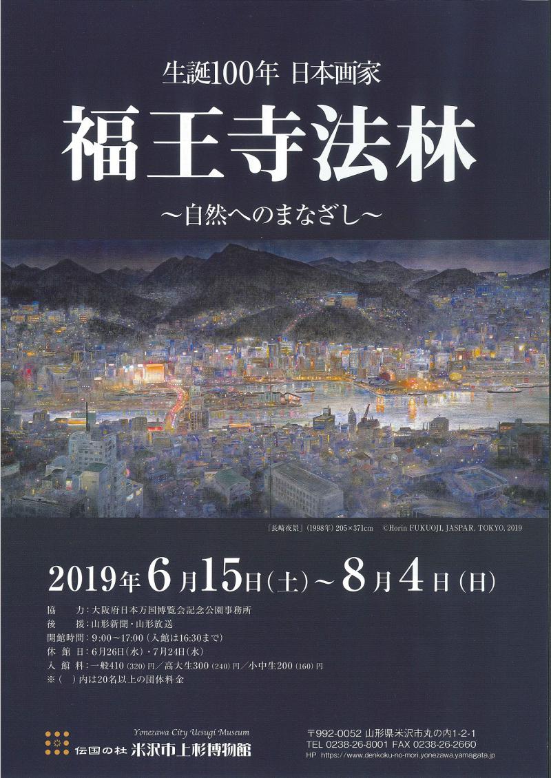 米沢出身の日本画家福王寺法林(1920―2012)は、92歳で亡くなるまで生涯絵筆を持ち続けました。幼い頃から絵を描くことに強い思いを持っていた法林は、不慮の事故で隻眼となっても画家になる夢をあきらめませんでした。それどころかそのハンデをまったく感じさせない画力と気迫を持続し続けた稀有な画家です。出兵という大きな人生の岐路にあっても帰国して絵を描くことを心のよりどころとして生還しています。その不屈の精神が、厳しく清廉な自然と向き合ったとき 神聖なまでの空気をまとった作品が生み出されました。夜景やヒマラヤの壮大な鳥瞰図は法林の真骨頂として高い評価を受けるとともに、日本美術院の重鎮として長年活躍し、平成16年文化勲章を受章しました。