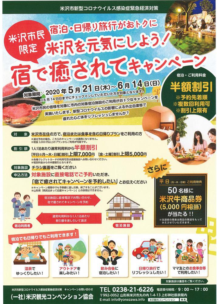 新型コロナウイルスの影響で大変な状況になっている米沢の観光ですが、このプランで宿を応援し、市民の皆様も疲れた心と体を癒していただき、米沢全体が元気になるようにキャンペーンを実施してまいります!