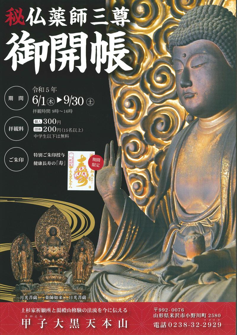 西川町大井沢にあった湯殿山四ケ寺のひとつ大日寺より遷座された薬師三尊のはじめてのご開帳です。薬師如来は左手に薬壺を持っているのが特徴で、人々の病苦や災難を除くとされます。左右には日光菩薩と月光菩薩を伴う三尊形式です。この尊い御縁にご参拝いただき、皆様の無病息災をお祈りください。ご開帳期間中は薬師三尊を堂内に安置いたしますので、目の前でご参拝いただけます。