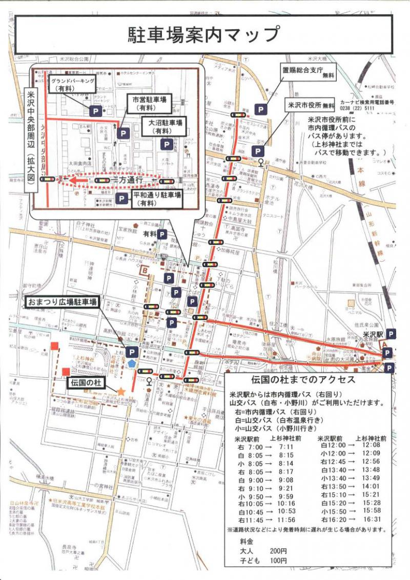 そのほかは米沢市内の有料駐車場、米沢駅前駐車場にお停め頂き、会場までの路線バスをご利用してお越しください。
