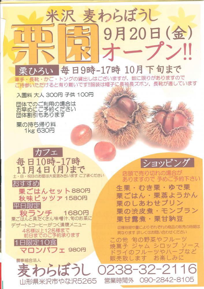 10月下旬頃まで栗拾いできます。栗園期間中は無休で営業いたします。