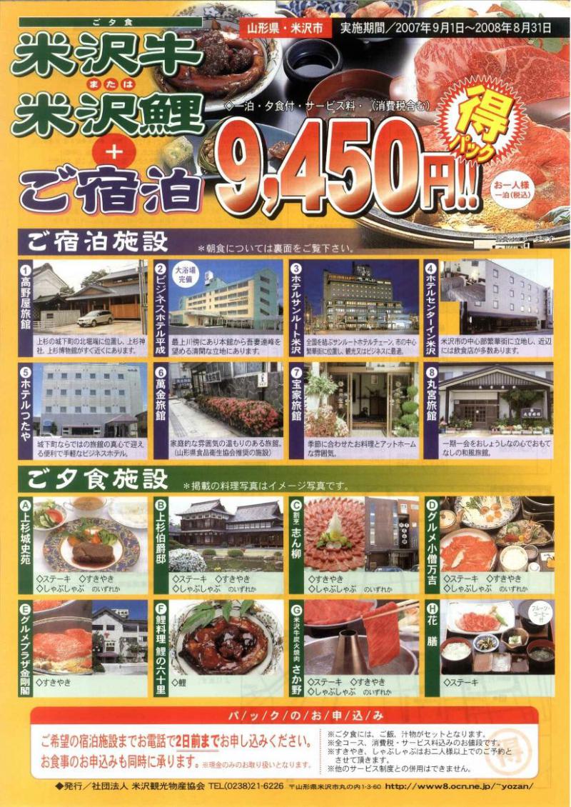 ▼平成19年度版「米沢牛・米沢鯉宿泊マル得パック」9月からスタート!