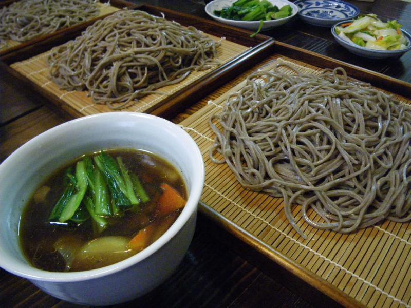 [画像]これはどう考えても「鴨南そば」でしょ〜。天然の鴨は風味がすごく強いのですがアクがまったく出ませんでした。ガラは圧力鍋で炊き、ごぼう、にんじん、だいこん、ねぎをたっぷり。豆選別や除雪作業をしていた援農隊が、どんぶり入りの鴨汁でそば12人前を瞬く間に平らげます・・・。食後は皆で伊佐沢散歩。久保の桜の雪化粧の前で記念撮影をしました。[画像]