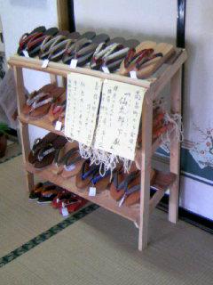 蕎麦屋の座敷にカラフルかな下駄が並んだコーナーがあります。