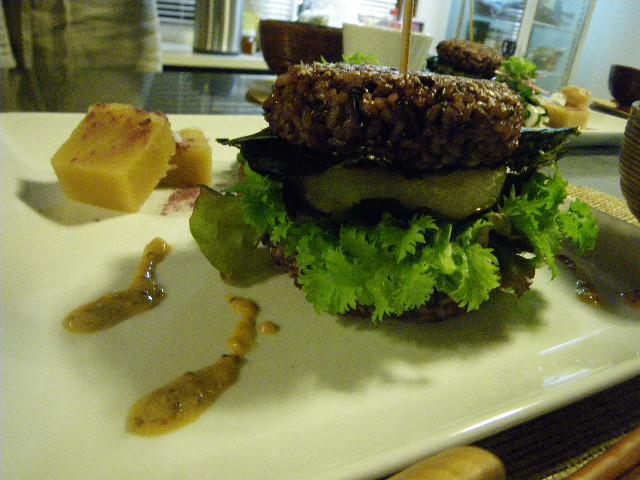 味噌尽くしのレシピの中でも、写真の「黒米入り玄米ライスバーガー」が美味かったです。具は大根ソテーで、季節によっていろいろ応用できそうですね。