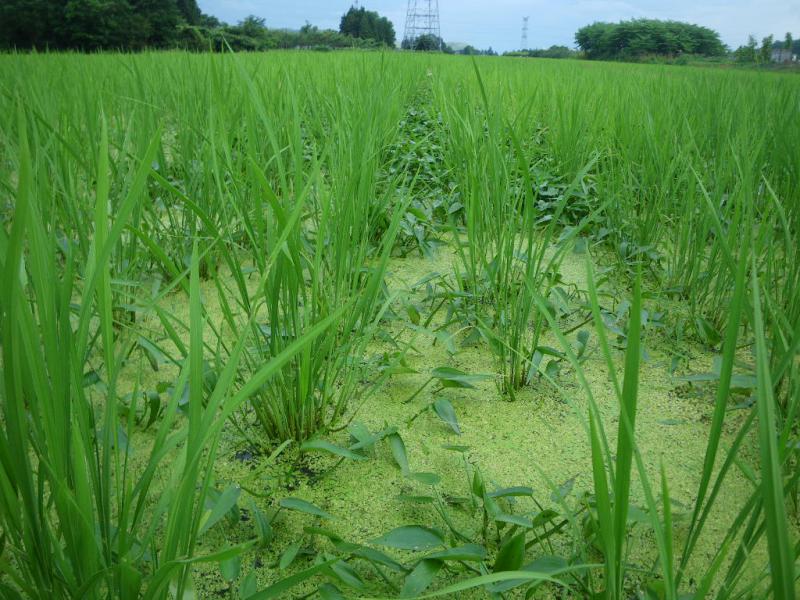 田植え直後、試しに米ぬかとおからのペレットを散布した田は生育が良くない。
