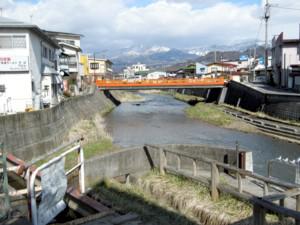 画像のアングルの場面で、赤い橋の左側の黄色い建物が天竜飯店さんの店舗です。
