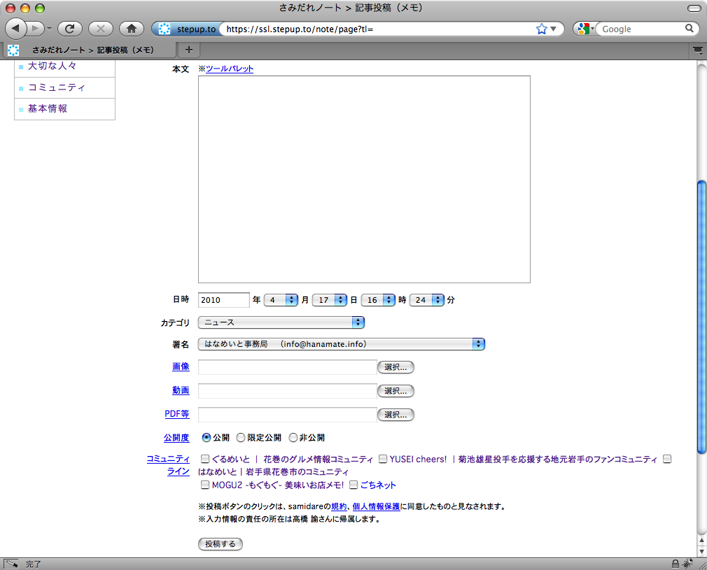 でご確認ください。 ※1度の投稿で添付できるファイルの容量は10メガまでとなります。 ▽公開度 「公開」を選択した場合、この記事は誰でも閲覧することが できるタイプの記事になります。 「限定公開」を選択した場合、限定された人にのみ公開される タイプの記事になります。つながりあうコミュニティ内メンバーのみ 閲覧できます。 「非公開」を選択した場合、自分自身しか閲覧することができないタイプの 記事になります。つまり、管理画面内でのみ閲覧するための情報となります。 ▽コミュニティライン 何かしらのコミュニティに参加している場合、そのコミュニティ名が 表示されます。 「はなめいと」に参加されている場合、そのチェックボックスが表示されて いますので、チェックしていただくと「はなめいと」のカテゴリが表示されます。 投稿する記事の内容に沿ったカテゴリを選択します。 情報入力後、一番下部の「投稿する」をクリックして投稿が完了します♪