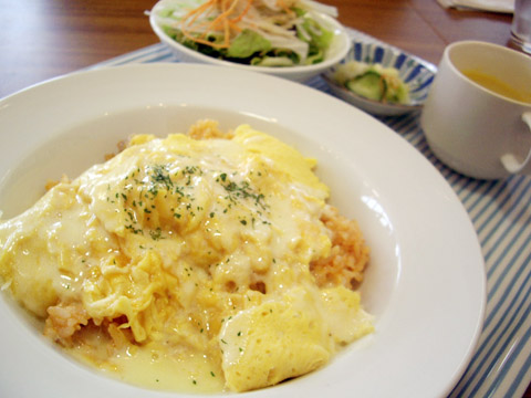 ふわとろ〜な「オムライス 680円」を注文。 味噌汁・お新香付きです。 ソースは以下の3種から選べるそうです。う〜ん、迷いますね。 ・デミグラスソース ・クリームチーズソース ・トマトソース 写真は「クリームチーズソース」です。 味噌汁付きですが、スープに交換できるようです。 今日のスープはあま〜いカボチャのクリームスープでした(^_^)v
