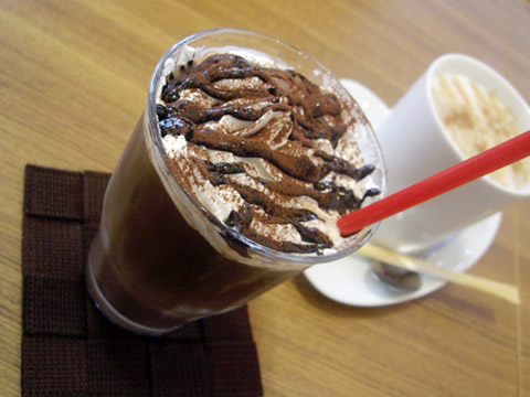 ご注文のメニューにプラス100円でドリンクがつけられます。よくあるセットメニューではありますが、ジュース類からカフェ類まで250円〜400円!のものが「100円」です。すばらしい。 写真は「チョコモカ(アイス)」。 この「チョコモカ」は元値は400円!それが100円で飲めるわけですから、こら頼まずにはいられません!