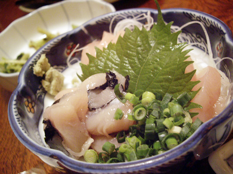 とりの刺身、うまいね〜 高橋は初めて食べた。 海苔で巻いたものもあります。400円!