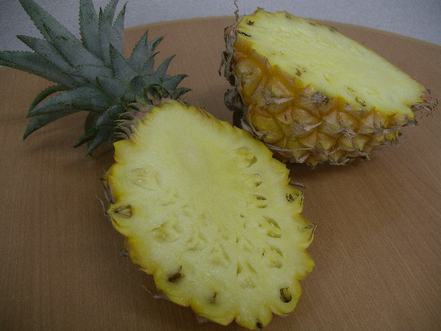 スナックパインを割ってみると、とってもみずみずしく甘酸っぱいかおりがお部屋いっぱいにひろがります♪