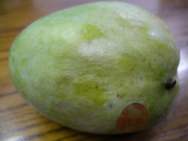 完熟すると皮が赤くなる アーウィン種の小ぶりな「アップルマンゴー」に対して 大ぶり「キーツマンゴー」は緑色のままです。