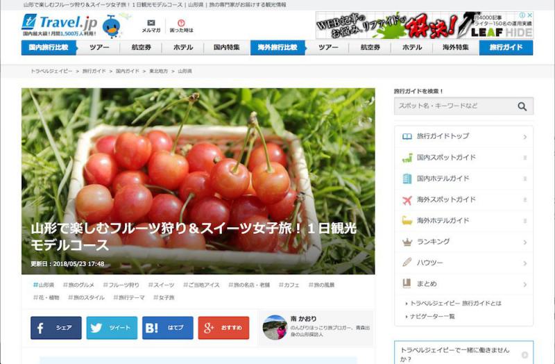 トラベルジェーピーの「山形で楽しむフルーツ狩り&スイーツ女子旅!1日観光モデルコース」にフルッティアをご紹介頂きました![画像]フルーツ王国山形の観光をぜひお楽しみ下さい。→ 「山形で楽しむフルーツ狩り&スイーツ女子旅!1日観光モデルコース」の紹介ページはこちら