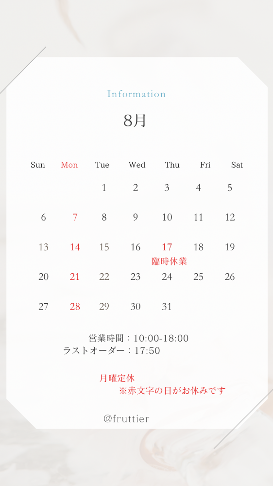 8月は月曜の定休日に加えて17日(木)を臨時休業とさせて頂きます。※お盆の8月14日(月)もお休みとなります。