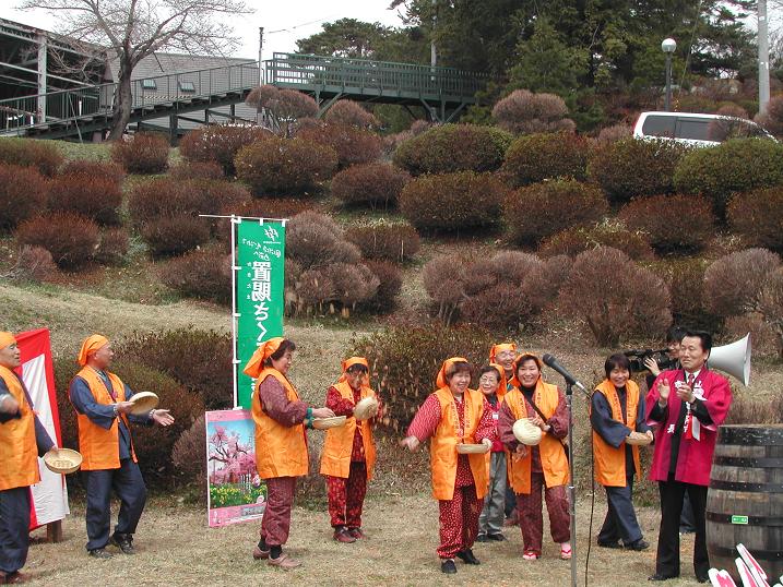 花咲か爺さんと婆さんに扮したボランティアガイドの皆さんが、「花咲け〜」と灰(籾殻)を撒きます。きれいな桜が咲きますように♪