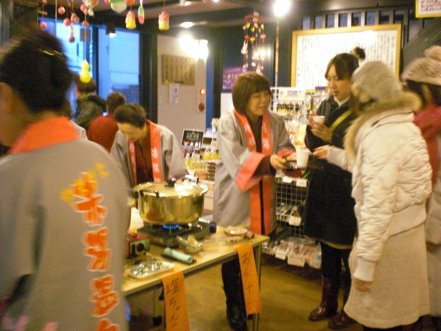 甘酒、玉こんにゃくの振る舞いのほか、鍋の販売も行われ、館内はお客様でいっぱいです。