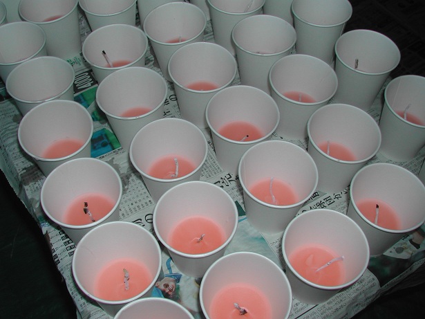 紙コップに”ろう”を流し込み、固まりかけたところに”芯”をさしていきます。