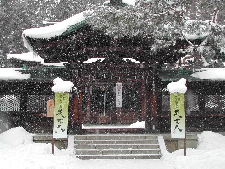 こちらは上杉謙信公が祀られている「上杉神社」。りっぱな本殿です。雪景色がよく合いますね。