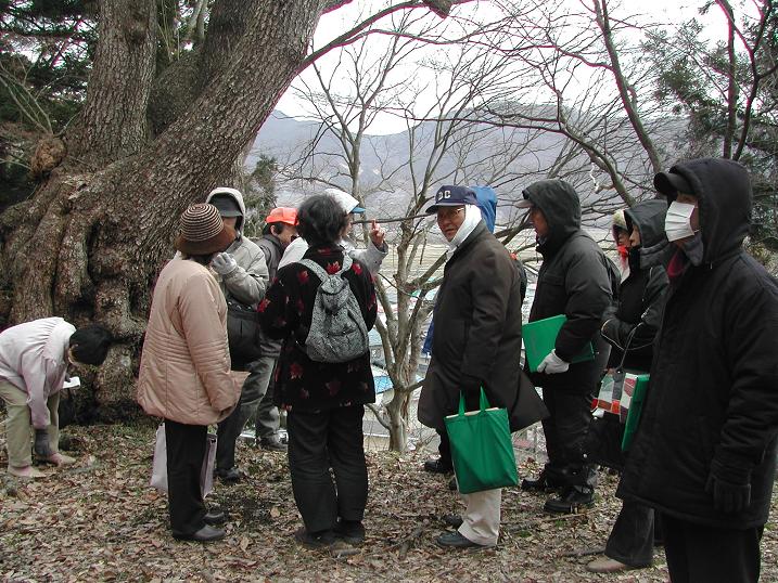 公園内にある様々な桜を丁寧に説明していただきます。また桜だけではなく烏帽子山について詳しく教えていただき、大変勉強になりました。鈴木さんの知識の豊富さに感心させられます。ありがとうございました。会員の皆さんも寒いなか、お疲れ様でした!