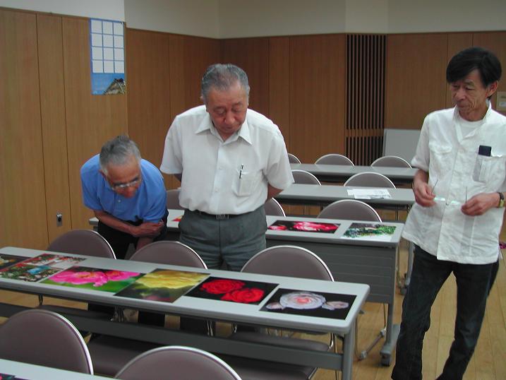 審査委員は南陽写友会の佐藤吉栄会長と遠藤博さん、そしてバラまつり委員会から小幡委員長です。 たくさんある作品をひとつひとつ丁寧に審査していただきます。 審査結果は後日発表しますので、しばらくお待ちください。