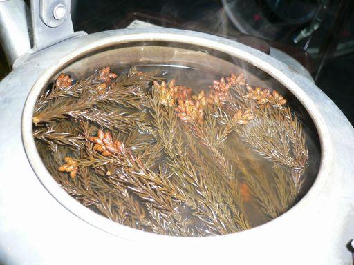 じっくりと煎じたスギの汁は黄色から黒っぽい黄色に変わる。