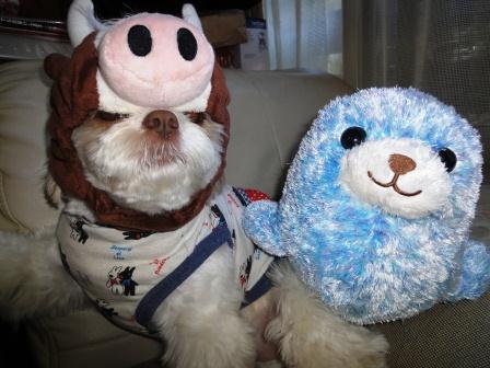「スピア」は、丑年買った牛の被り物を被せられて不機嫌気味・・・