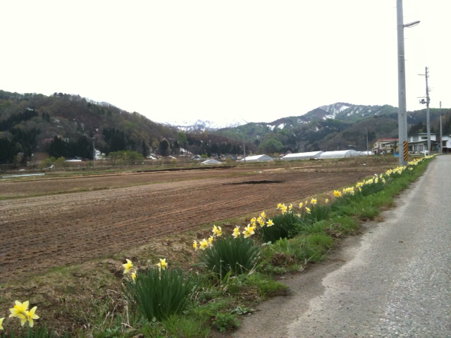 水仙ロードです! とても見ごろでした! 奥に見える残雪の残った山は 霊峰≪ 飯豊山 ≫です!
