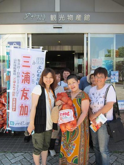 当店人気商品! 玉ねぎ10キロ1000円! をお持ちいただいております方が 三浦友加さんです! むかって左隣の方が YBCラジオ 佐藤孝子さんです!