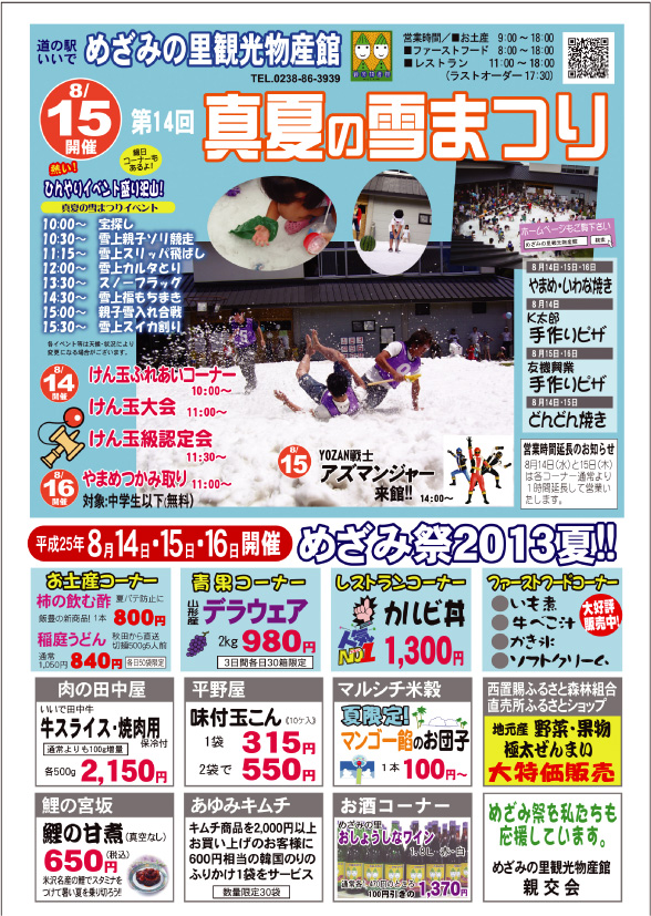 ご不明な点等ございましたらば、 道の駅いいで めざみの里観光物産館 0238−86−3939 までお問い合わせお願い致します。 皆様のお越しを 雪と一緒にお待ちしております!!