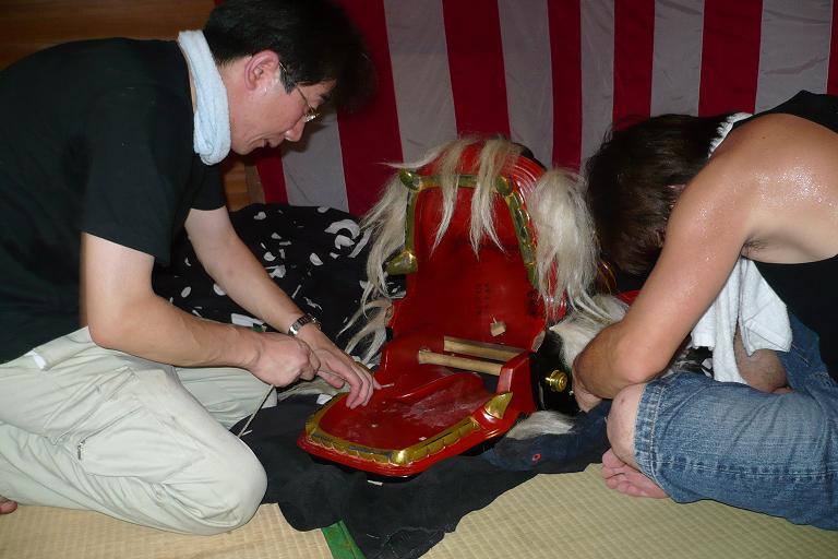 今日はお祭り本番です。今日は朝から獅子に幕付け等の作業をしました。たくさんのお客様が見に来ていただけると祭りも盛り上がります。 今日、明日頑張りますので、皆さん是非見に来てください。
