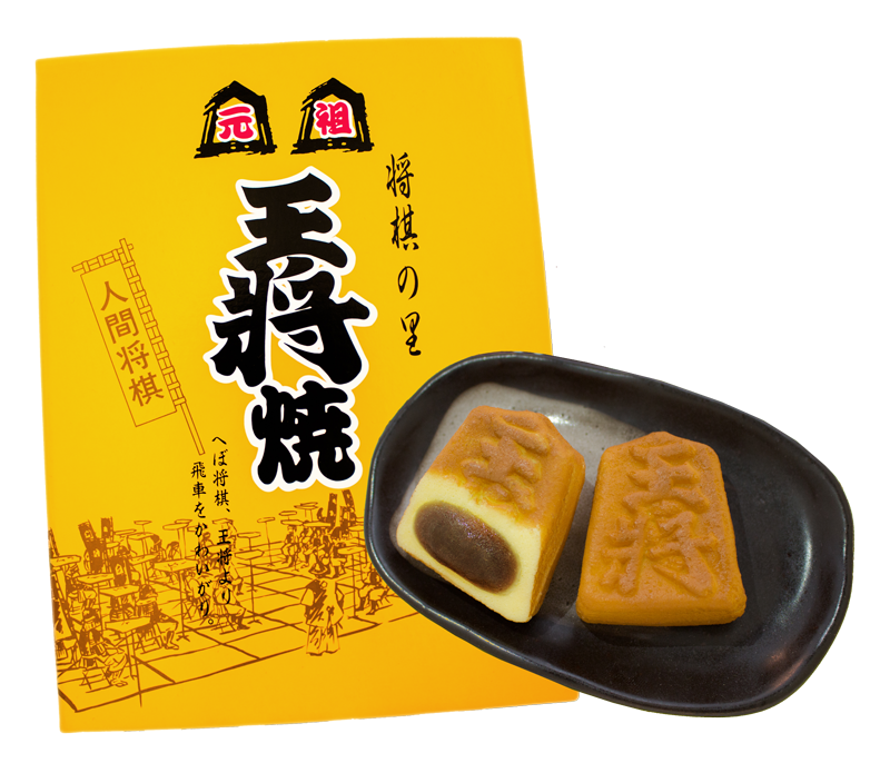 将棋の形をしています。中にはこしあんがたっぷり入っています。王将焼8個入(800円税込)もございます。8個入はコチラ