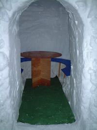 今年のかまくらの改善点。すべる足元を何とかすべくできたのが、人工芝です。かまくら内部はより快適空間に変わります。