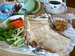 パンに味噌風味のペーストを塗り、野菜と一緒に巻いて食べます。