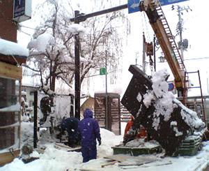 インフォ脇の看板が新しくなります。こちらが工事風景。クレーンにつられているのが旧看板、左の雪にささっているのが新看板。雪の中の工事、ごくろうさまです。