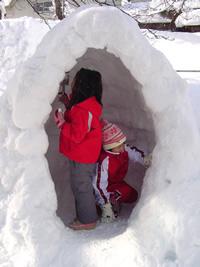 2人用かまくらに行ってみると、まほちゃんとひかりちゃんが小さな隙間を埋めるべく補修工事の真っ最中。いろんな人に支えられているかまくらでした。