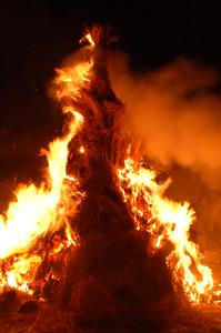 昨年のお札(ふだ)やお正月のしめ飾りなどをわらで作った大きな塊に入れ、燃やす行事です。