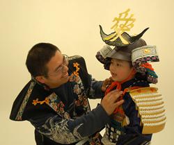 ▼直江兼続モデルの稚児鎧を着用して、記念撮影を行う。