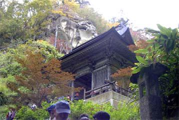 紅葉が彩る、秋の山寺の仁王門の風景写真。