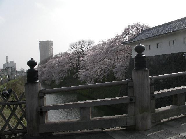東大手門から望む霞城セントラルです。土手の桜がとても綺麗です。
