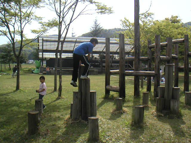 機関車の側には丸太で出来たアスレチックや砂場などがあります。