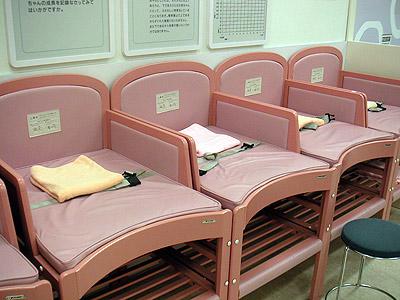 5台のベットがならんで、ちょうどいいベットの高さで「おむつがえ」らくちん。