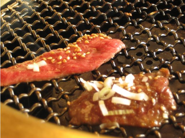 ▼お肉を網で焼いて...
