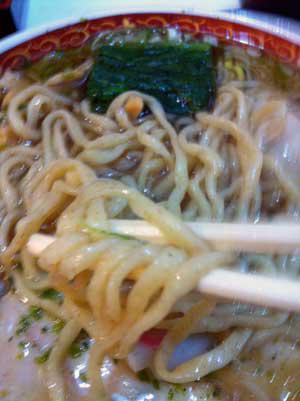 麺はスープが絡みやすいもちもち平打ち太麺。