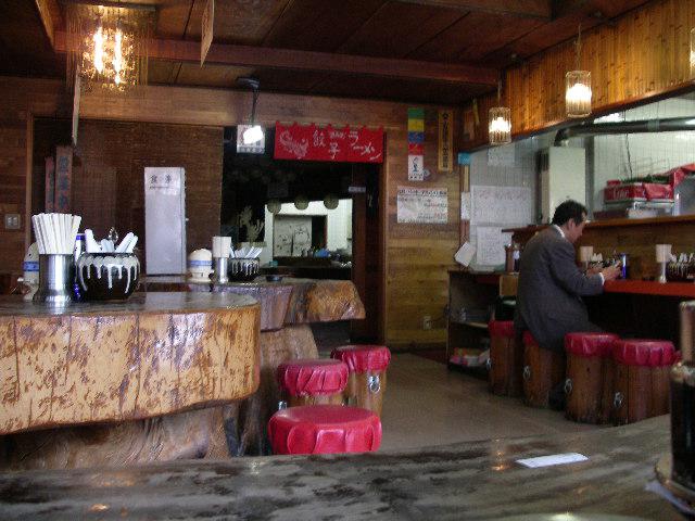 切りかぶのテーブルを中心に、丸太の椅子が並んでいます。食券を購入してから注文するシステム。