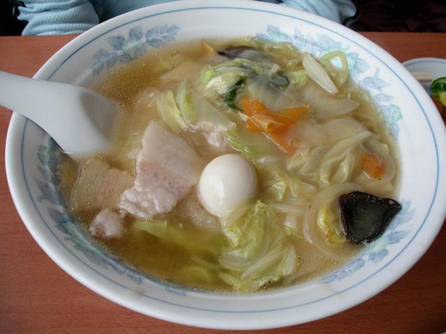 炒めた肉や野菜の具をのせた塩味のラーメンです。