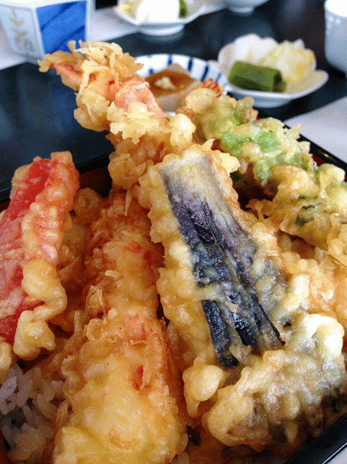 海老天と季節の野菜等ふんだんにのせた