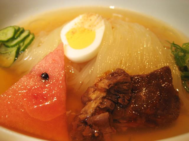 焼肉で定評のある山形市百味亭の【手打平壌冷麺】は、つるつるとコシのある本格手打ち麺です。