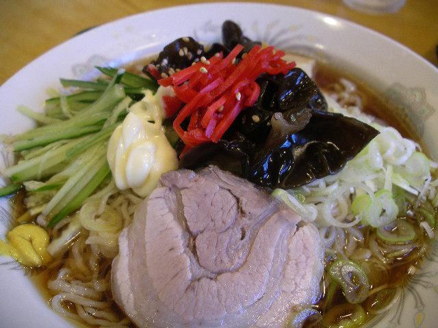 自家製麺の玄龍《冷やし中華》やわらかチェーシュー、キュウリの千切り、キクラゲやネギ、紅ショウガ等がトッピングされています。さわやかで甘酸っぱい醤油味。からしとマヨネーズは別添えです。