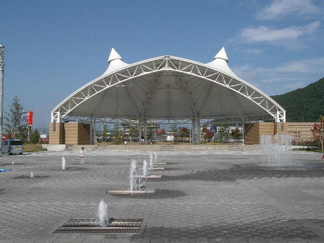 道の駅天童温泉の奥には野外ステージや噴水広場があります。この日は噴水とあわせて「となりのトトロ」がBGMで流れていました。
